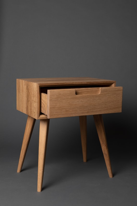 ( 2.7) out of 5 stars. These pieces are both stylish and functional, as they provide storage for small items you want to keep by the bed. A mid century modern bedside table can not only bring a clean look to your bedroom but also serve as a convenient spot to place a lamp or alarm clock, to store books, or to set down a glass of water. Four tapered legs are the only assembly needed on this stunning piece. Clean lines, two drawers with recessed pulls, and tapering, flared wood dowel legs.